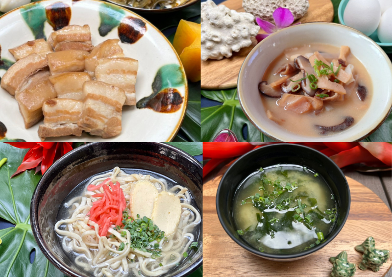 地元の食材をふんだんに使った美味しい料理で身体をつくるちゃんぷるー、ラフテー(肉)、あぐ~(豚)、卵など