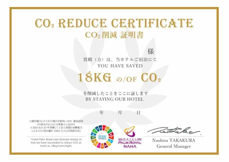 2022年1月より、ホテルパームロイヤルリゾート国際通りでは、SDGsへの取り組みの一環として全館の電力を動植物由来の資源から発電する*バイオマス再生可能エネルギー、「美ら島CO2ゼロプラン」に切り替えました。これにより当館の使用電力から排出するCO2は実質0になりました。