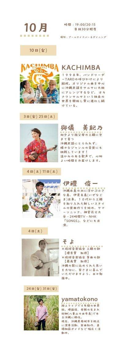 10月の週末(金・土)、外部アーティストによるライブ演奏 が心地よい秋の夜を盛り上げ、音楽とともに、のどごし抜群のドリンクをご用意して皆さまをお迎えします。